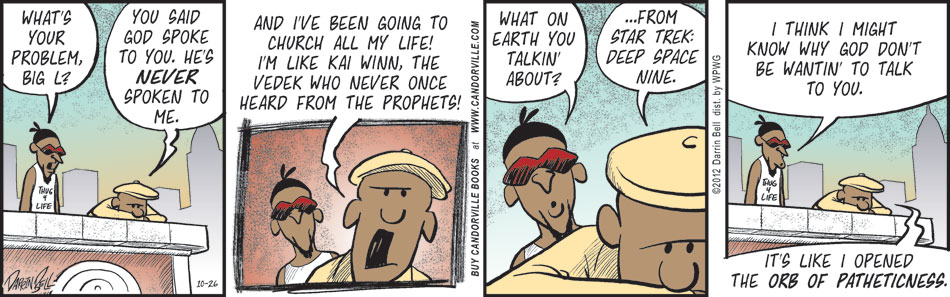 What's your problem, Big L? You said God spoke to you. He's NEVER spoken to me. And I've been going to church all my life! I'm like Kai Winn, the Vedek who never once heard from the Prophets! What on Earth you talkin' about? ...From Star Trek: Deep Space Nine. I think I might know why God don't be wantin' to talk to you. It's like I opened the Orb of Patheticness.