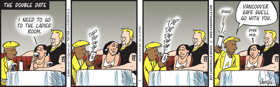 The Double Date. I need to go to the ladies' room. Tap tap tap tap t- Tap tap tap tap tap t- ding! Vancouver says she'll go with you. Dios mio.
