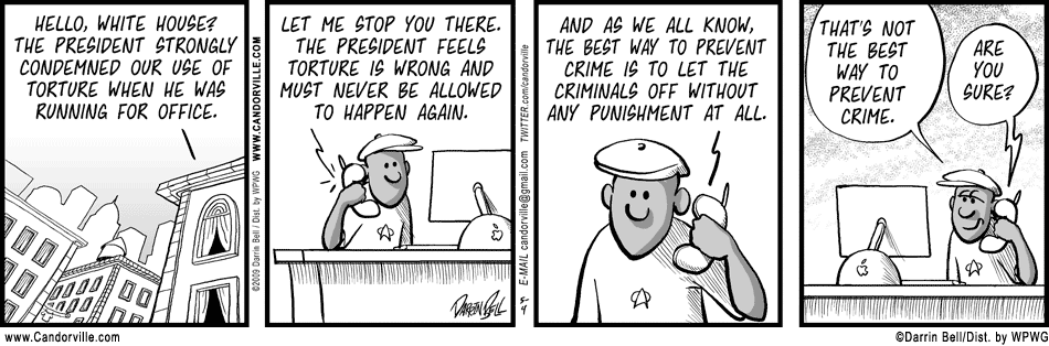 Hello Mr. Bell, I am an occasional reader of your strip, Candorville. I felt it was necessary for me to voice my opinions about your cartoon published in the Washington Post on May 5th, 2009. Sir, I happen to agree with your apparent sentiment that waterboarding is a cruel and unnecessary measure in interrogation of terror suspects. I believe that there is no place for inhumane or uncivilized tactics in this or any government or military service. However, I took offense to the way you expressed your beliefs on the matter in your cartoon. I want to make abundantly clear that comparing the war crimes of the Japanese Empire to the modern practice of waterboarding is foolish and highly insensitive to those who were prisoners of the Japanese in the far east. Just because our veterans of the second world war are dying at an accelerating pace and disappearing does not give you the right to revision history and diminish what allied and civilian prisoners suffered through. Comparing having water dripped over your face to the horrific inhumane brutality that allied POWs experienced is a minor injustice. Waterboarding is not nearly as violent and horrible as being forced to watch your officers executed by beheading, being forced to consume your own excrement, being beaten constantly, often times to death. Not to mention the fact that the Japanese even crudely crucified some prisoners who vocally shared their Christian or Jewish beliefs. The Japanese forced millions of southeast Asian peoples into slave labor in order to build railroads to carry their oppression into India. roughly 11 million southeast Asians and a much smaller number of allied POWs died at the hands of the Japanese as they built these railroads. There are many other atrocities committed by the Japanese Empire, but you probably get my point. While I agree with your sentiment, your delivery was downright inappropriate. My Grandfather served during World War II in the pacific theater. I’m sure that if he were alive today, he would share my sentiments. You do not need to do so, but I look forward to your response. (P.S. I do enjoy your strip Sir!) Very Respectfully, [Name withheld by Candorville.com] Cadet, Virginia Military Institute class of 2012 Naval MidshipmanAnd, my response: Dear Mr. [Name withheld by Candorville.com], Thanks for taking the time to write, and for occasionally reading Candorville. I’m glad you’ve given me the opportunity to clear up a few things. I’ll try to answer you point by point to make sure I don’t miss anything.
