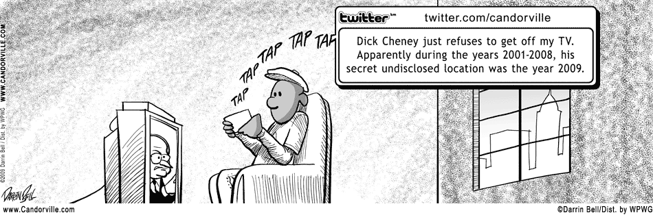 Dick Cheney just refuses to get off my TV. Apparently during the years 2001-2008, his secret undisclosed location was the year 2009.