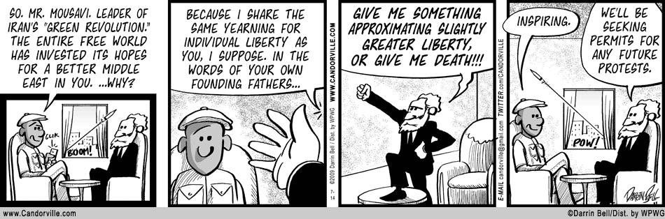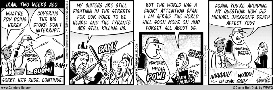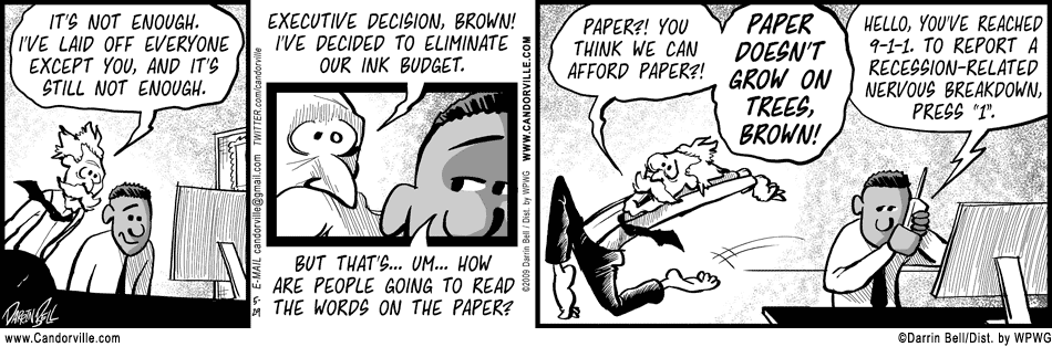 ATTN Monterey County-ites: The Monterey Herald will be dropping Candorville on January 4 to make room for a local cartoonist. From the looks of it, Candorville was targeted because it was a more recent addition. If you’d like to see Candorville stay in the paper, send an email right NOW to [email protected] and tell them so.
